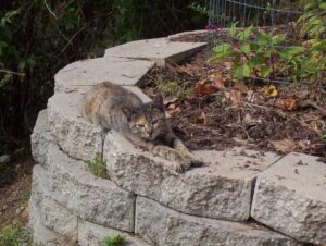 One Saturday morning in the early spring, Flavia disappeared. We searched everywhere but couldn’t find her. Three weeks to the day, she returned – again on a Saturday morning – hungry and skinny. She came inside and ate and ate, and all the while we petted her and she purred and purred. From then on, she loved being petted while she ate – we called it “scratch and eat.” Anytime we started petting her, she would run to eat. I’ve always been convinced that she got locked inside a lawnmower shed and didn’t get out until the neighbor went to mow the lawn again. I don’t know how she survived that long, but she did! After that, we started training her to be an inside cat!
