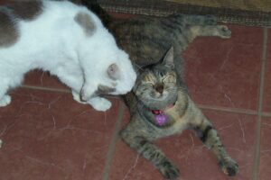 When we adopted Flavia, we already had Noodle, a silly gregarious cat. Noodle used to love licking Flavia’s ears and she always tolerated it. Noodle died when we were living in Ciudad Juarez. We always joked that when he died, Flavia started saying “I’m #1!”