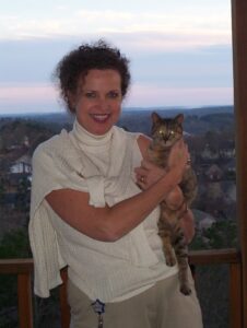 The photo above was taken in 2004, I think, when she was just a kitten and still an outdoor cat. We were on the back deck at our house on Saddle Hill in Little Rock. It was a high deck – two stories off the ground – so we had a ladder built on the back of the house – a series of landing pads – so she could climb up and come to the kitchen door. To teach her to use it, I dangled chicken bones on a long string over the edge and she learned quickly how to use the ladder!