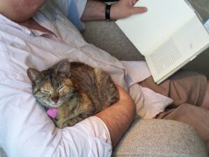 I love this photo so much. John is in his happy place with a book and a very contented cat! Her face just radiates happiness and security to me.